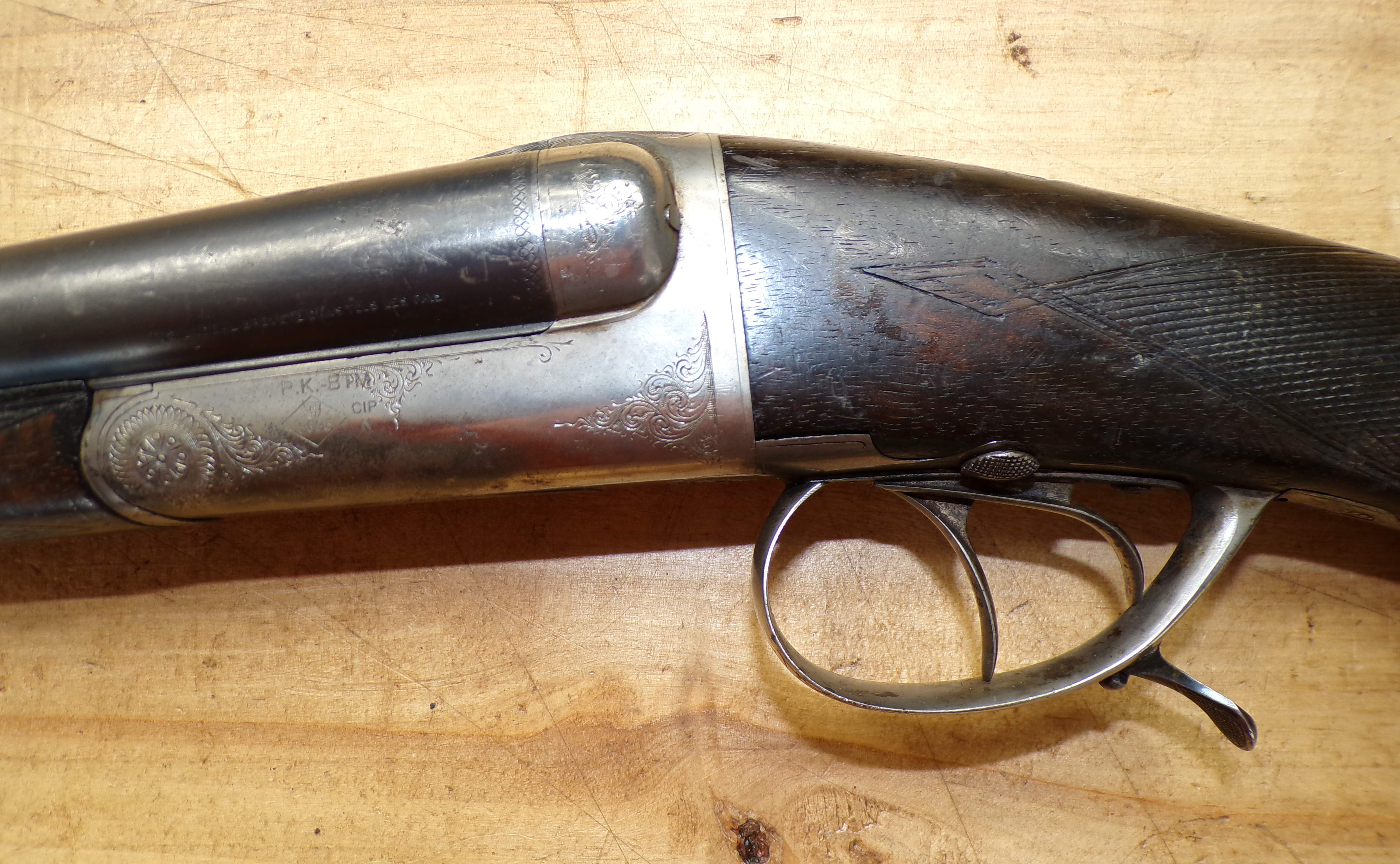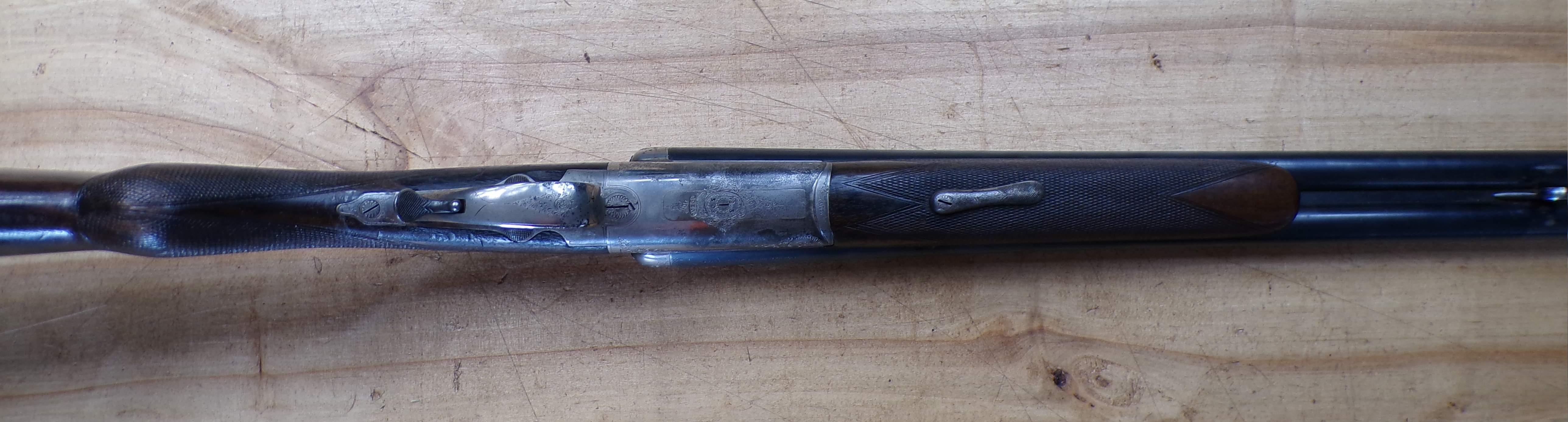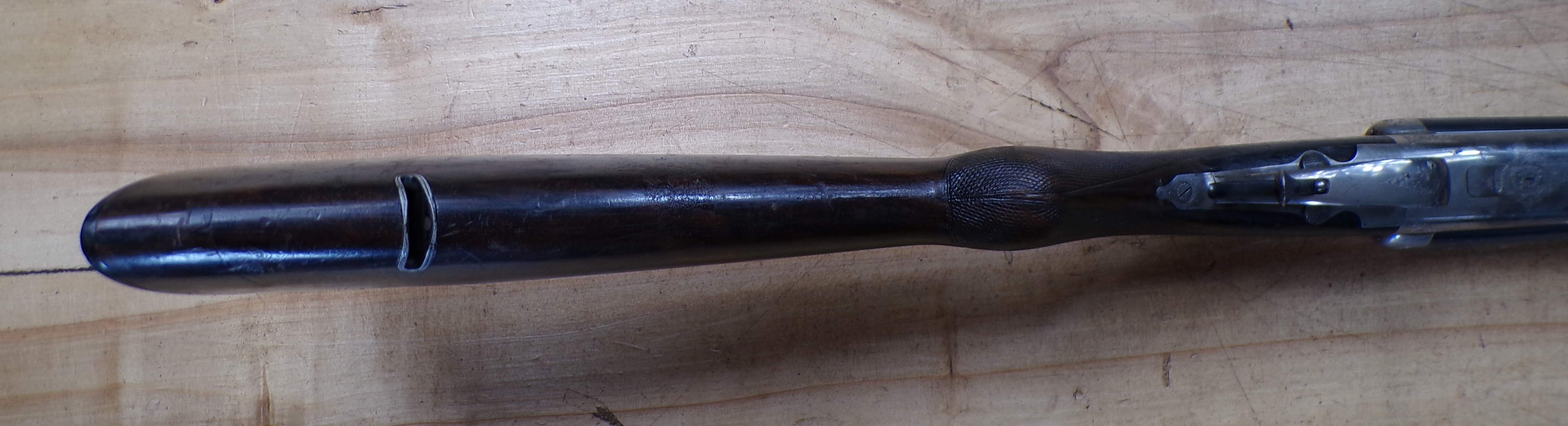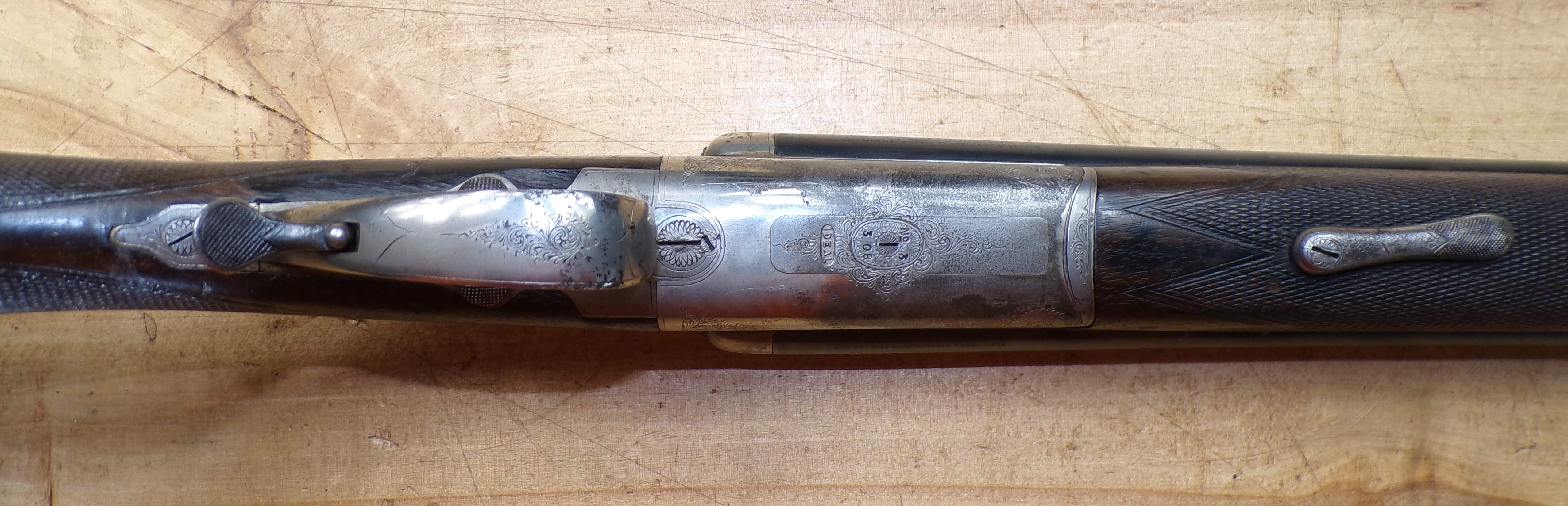 Stan dobry, na lufie są odciski płótna w które zawinięta przeleżała gdzieś lata. Ciekawy francuski system napinania kurków i otwierania luf za pomocą klucza umieszczonego przy kabłąku a nie na wierzchniej części basklili jak zazwyczaj. Wszystkie części oryginalne, drewno nie popękane. Płetwa kolby była przedłużana. Na lufie i baskili są stemple odbiorcze CIP.